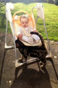 His name is Branches and his meow is very loud. His fur is very soft and black and brown and of course he is very gentle. Branches is very soft. Here is a photo of me as a baby meeting Branches.